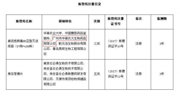 根據(jù)《獸藥管理?xiàng)l例》和《獸藥注冊(cè)辦法》規(guī)定,經(jīng)審查,批準(zhǔn)華南農(nóng)業(yè)大學(xué)等9家單位申報(bào)的禽流感病毒H5亞型滅活疫苗(D7株+rD8株)等2種產(chǎn)品為新獸藥,核發(fā)《新獸藥注冊(cè)證書(shū)》,并發(fā)布產(chǎn)品試行規(guī)程、質(zhì)量標(biāo)準(zhǔn)、說(shuō)明書(shū)和標(biāo)簽,自發(fā)布之日起執(zhí)行。