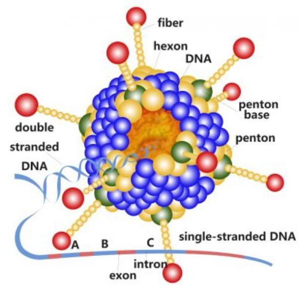 FAdV-Ⅰ為腺病毒科腺病毒屬病毒,無囊膜,直徑為70-90nm,呈20面體對稱結構。表面由252個殼粒組成,包括240個六棱體和12個五棱體,每個五棱體有2條纖維突起。中間包著直徑60-65nm的髓蕊雙股DNA和核蛋白,殼粒排列在三角形的面上,每邊6個殼粒。禽腺病毒具有2根長度相近的纖絲,纖絲的長度與抗原性有關。