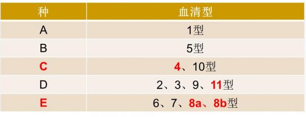 根據限制性內切酶消化不同FAdV-Ⅰ分為ABCDE 5個種。根據血清交叉中和試驗可分為12個血清型。A對應的血清1型,B對應的血清5型,等等。血清型8b11型之間有一定的交叉保護性,大部分血清型之間幾乎無交叉保護性。FAdV-Ⅰ主要在禽類呼吸道和消化道上皮細胞內復制,形成包涵體。C4型引起禽HPS;各血清型都能引起IBH,但主要是血清8a8b11型;A18a8b型能引起禽肌胃糜爛。